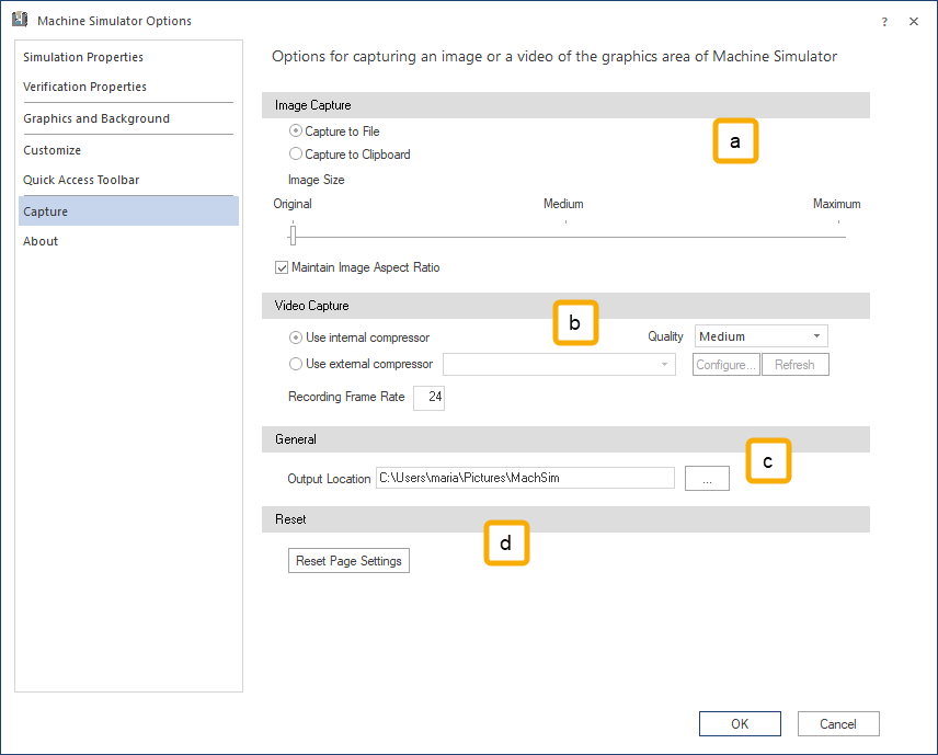 - The video file is saved in the specified Output Location folder. The file name format is "MachSim_Video_YYYYMMDD_HHMMSS.*", where YYYYMMDD is year-month-day and HHMMSS is hour-minute-second of the moment the capture was taken.