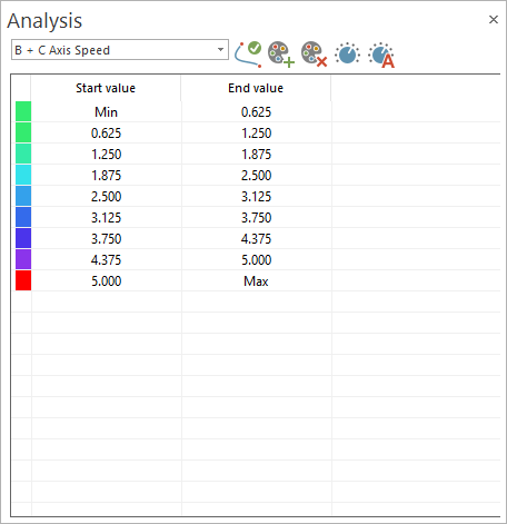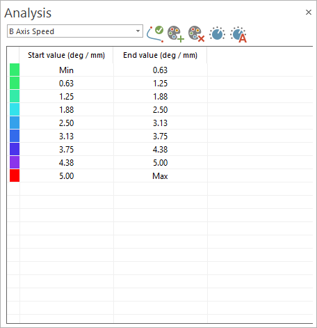 The toolpath will be colorized after the intervals for rotational axis speed.