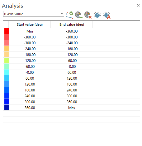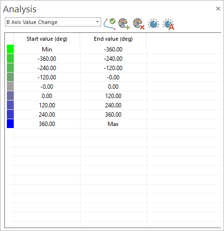 The toolpath will be colorized after the tilt angle of the machines rotation axis. The coloring of the toolpath is done based on angle intervals.