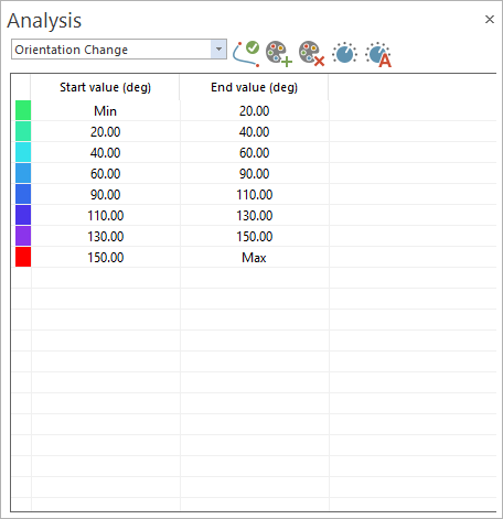 Angle change: defines the maximum value of the angle of the respective rotational axis that needs to be rotated between two consecutive moves. Only strictly positive values smaller than 100000 degrees are allowed. The value is used to define the color intervals for the list of colors.