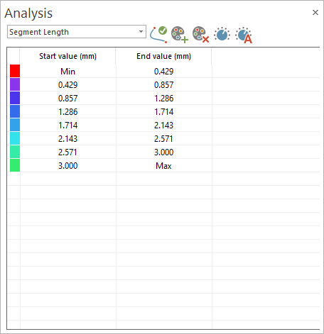 Reset to default: resets the minimum and maximum colors interval values for the toolpath segments. (which is 0.429 and 3, respectively).