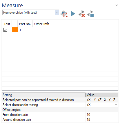 - Test: this will move selected chips in the direction that is set for "Select direction for testing". The test is also taking into consideration the offset angle from the direction axis and the offset angle around the direction axis