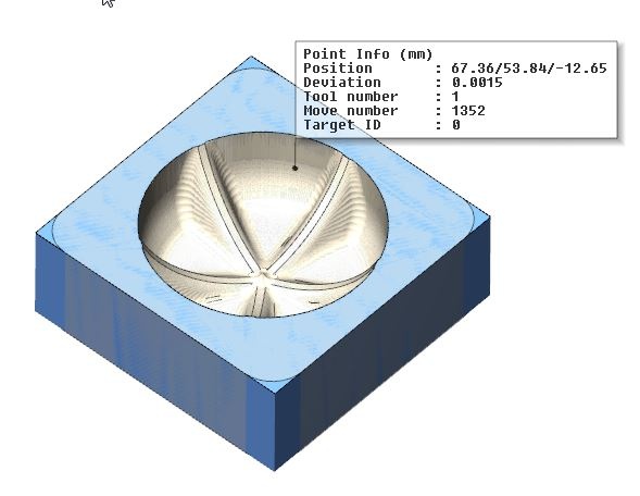 - Deviation: is the rest material distance to the target part (workpiece). Negative values means gouge (too much material cut in comparison with target part). Positive value means excess (not entier material is cut in comparison with target part). The value is calculated without the offset and is defined as Deviation abs. and with the offset, and is defined as Deviation rel.
