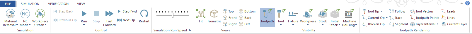 The modes should help the user examine the two main components of the simulation: toolpath (with partial gouge & collision check) and material verification (with complete in process material (stock) gouge & collision check).