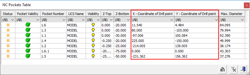 The XY center coordinates of the bounded circles for all pockets detected above the threshold value are displayed in two columns in the NC Pocket Table. These XY center coordinates are prospective drill points, and can be displayed in the NC Pockets Table using the Column Chooser.