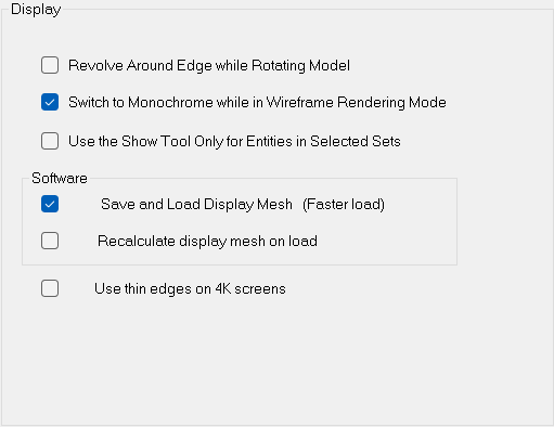 When this checkbox is ON This means that when loading a Cimatron file, the system ignores the existing display data saved within the file. This display data is kept within the file to reduce loading time. However, in some cases you may not wish to use the existing display data, for example when loading large files on lower end computers. |