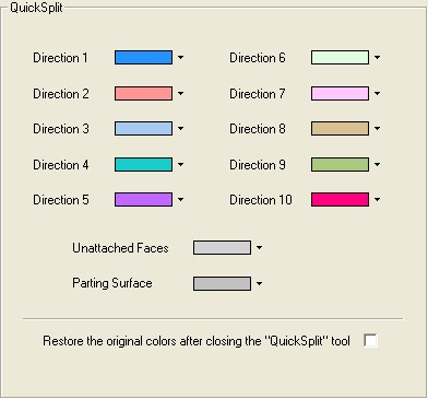 Set the default colors for the QuickSplit directions, the unattached faces, and the parting surface.