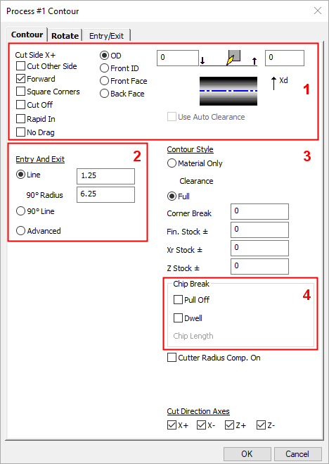 The Tool Trajectory parameters for Turning > Contours are displayed in a dialog.