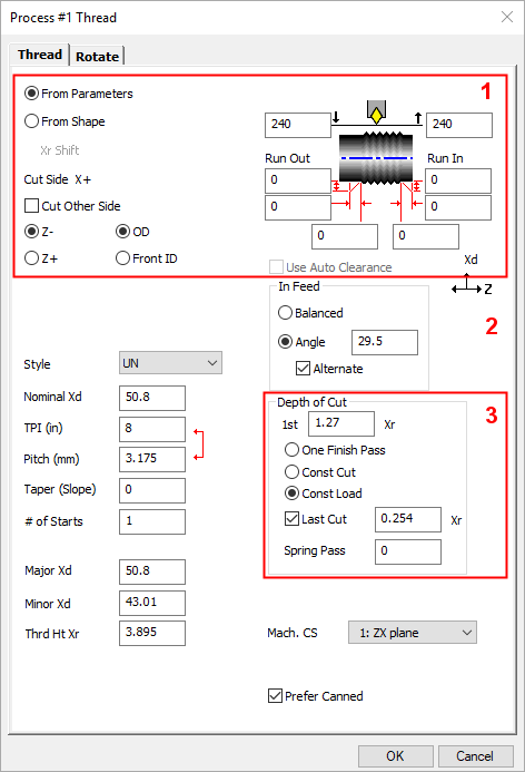 The Tool Trajectory parameters for Turning > Thread are displayed in a dialog.