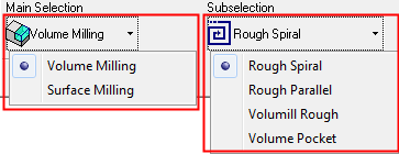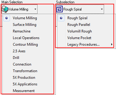 In the example dialog below, note that only the Volume and Surface Milling technologies remain selected, and within the Volume Milling, the Legacy Procedures are unselected. Only the selected items will appear in a Simple Mode partial list and the settings below are reflected in the example Simple Mode lists above.