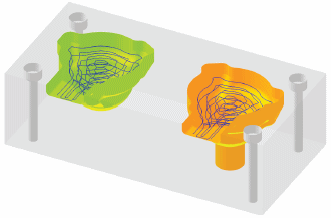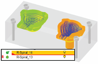 The user changed the downstep of the operation in the orange area. Because this change affected the remaining stock, an R symbol has popped up near the green area procedure. Since the green area procedure has clearly not been affected, the user can now remove the R symbol. The manual removal of the R symbol is recorded in the procedure’s log file. |