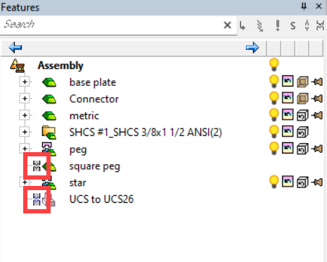 Internal—Right-click on the connect feature of a component to display the name of the other component, in the assembly, to which it is connected. For more, see Connected To.