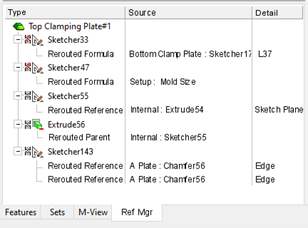 Rerouted links are identified by Cimatron as soon as an assembly is opened. All detected issues are displayed in the Ref Mgr tab.