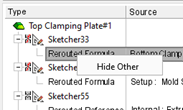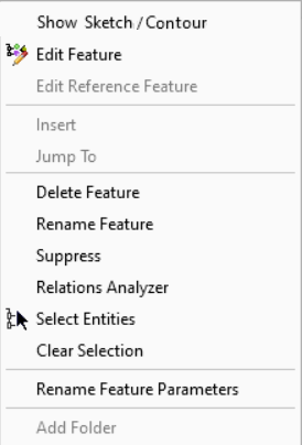 Show/Hide Sketch/ContourShow/Hide Sketch/Contour (that was used to create the component), Edit FeatureEdit Feature , Edit Reference FeatureEdit Reference Feature , Insert, Jump To, Delete Feature, Rename FeatureRename Feature, Suppress, Relations Analyzer, Select EntitiesSelect Entities , Clear Selection, Rename Feature Parameters, Add Folder.