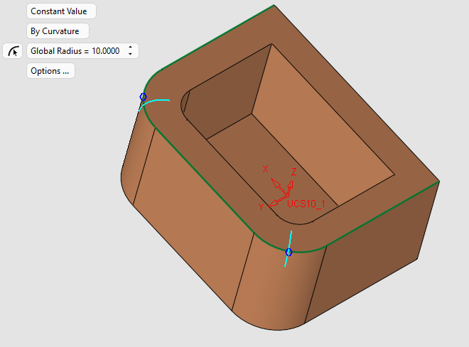At the ends of each edge, a radius value dialog will appear, reflecting the Global Radius specified above.