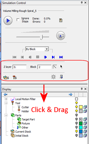 The default state of the various simulation dialogs is 'floating'. The Machining Time and Progress Bar dialogs are the exception; they are docked to the bottom of the screen. If required, the Simulation dialogs can be docked to the side of the Simulation window. In the example below, the Simulation Control window header is clicked and dragged to the left in order to dock it.