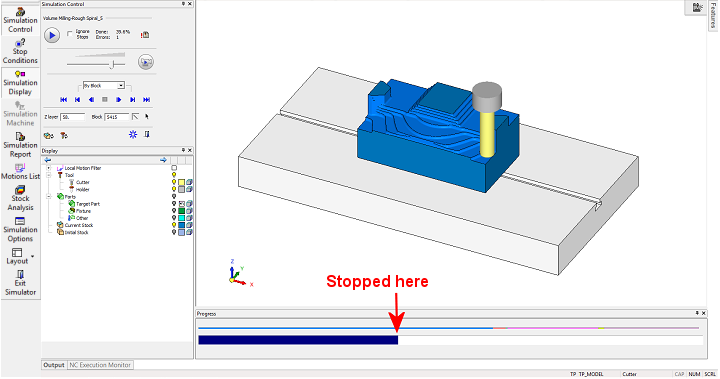 Results are shown when the simulation is stopped (for any reason). The image below shows what happens when the simulation suddenly stops somewhere along the first simulated procedure, as seen in the progress bar; the tool and stock have reappeared. The stock now shows its status at the current point.