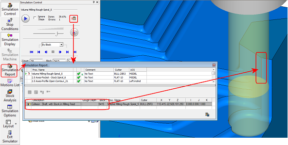 The Report dialog opens and indeed it shows that in block #5415 the shaft collides with the stock in feed.