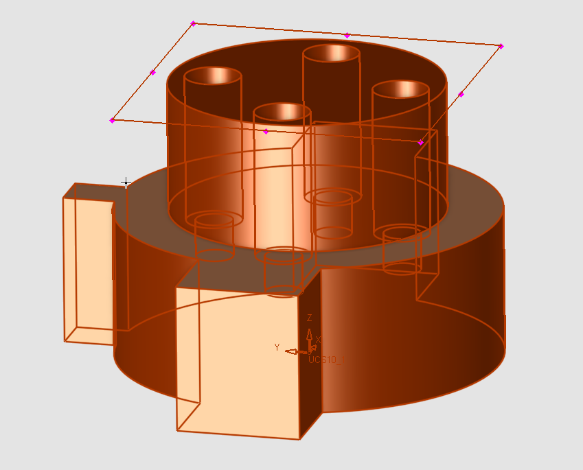 Sketcher display example showing the Sketcher toolbar and the sketch reference entities that will be used to create the holes in the part object shown on the right. |