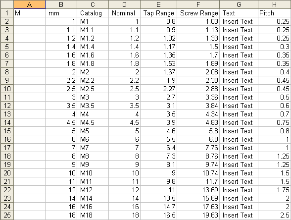 For each catalog row, the second column is the Thread type (selected by the user from the list), the third column is the actual nominal diameter of the thread (in mm or inch according to the definition in the header row). The fourth column is the screen parameter field text and the last column is the attached text.