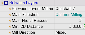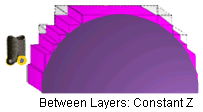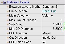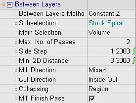 Acts as waterline cutting - material is removed in layers by constant down steps. Material can be removed as volume (sub selection: parallel cut, spiral cut, or stock spiral), or by contour milling.