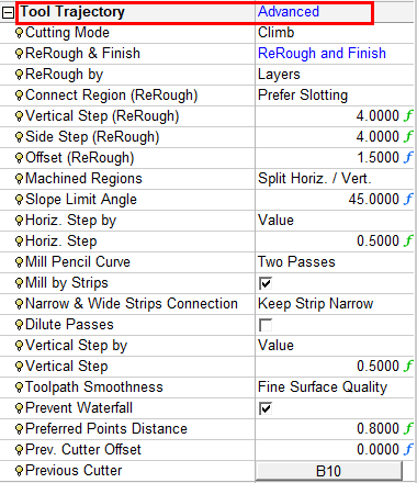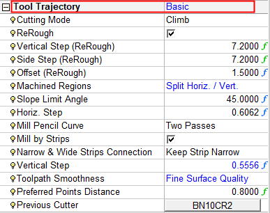 The Remachine > Cleanup > Tool Trajectory parameter table branch enables you to define the level of control over its use and over the display of the parameters in the branch. The following branch options are available: Basic and Advanced - Basic is the default option.