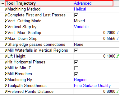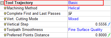 The Finish Mill All > Tool Trajectory parameter table branch enables you to define the level of control over its use and over the display of the parameters in the branch. The following branch options are available: Basic and Advanced - Basic is the default option.