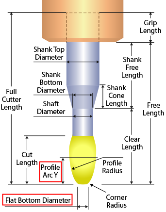 For Barrel Bull Nose cutters, at least one of the following parameters needs to be defined in order to create the cutter: Flat Bottom Diameter or Profile Arc Y. If these parameters are not available in the manufacturer's catalog, contact the manufacturer's support for these parameters and request the DXF files or drawings.