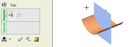 Note: In Trim operations, when using the Faces option and picking the entity to be trimmed, the position of the cursor is important; by default the picked side remains. For example, if you pick the top half of a face that is to be trimmed, the top half is the side that remains after the trim operation. You can use the Flip Trimming Side button in step 2 to change the side that is trimmed.