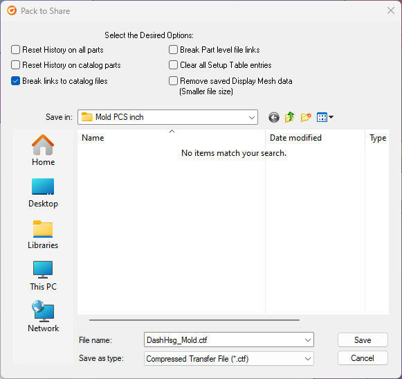 Remove the file links to all catalog based parts to be added to the CTF file (This option cannot be deselected). |
