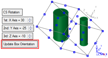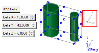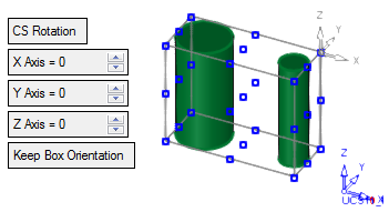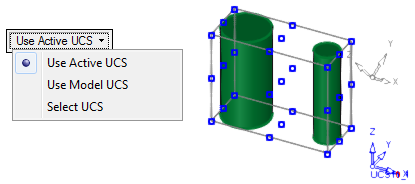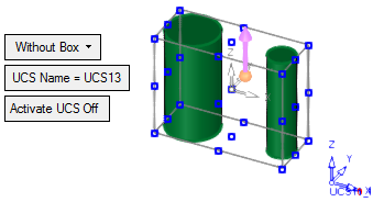 A temporary bounding box is displayed around the picked geometry, and reference points are displayed in the corners of the box and at the center of each face of the box. A UCS is created in the center of this box (the center of the picked geometry). This UCS is orientated according to the active UCS.