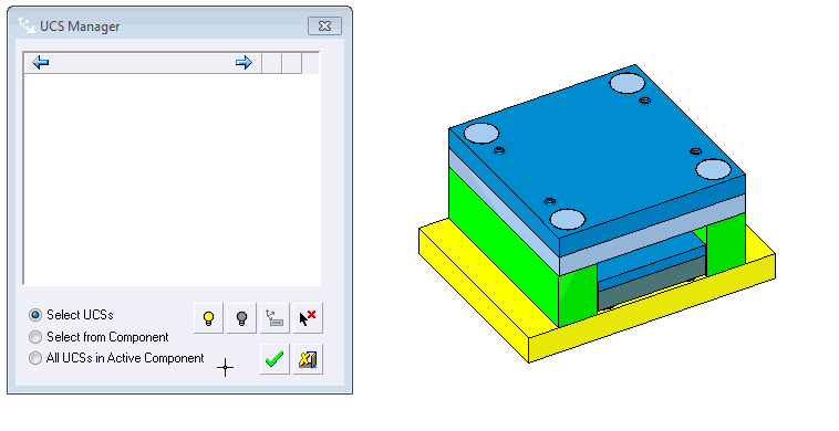 The UCS Manager is a UCS information management and selection tool, presenting one dialog where UCSs can be renamed or hidden. When used in an assembly, the UCS Manager allows you to turn off all the UCSs from the various parts with a single click.