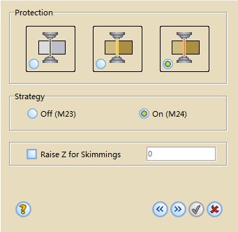 Raise Z for Skimmings: Activating this option and setting a numerical value in this field, the system will output G91 G00 Zx (where x is the value defined by the user) at the beginning of the skim cuts.