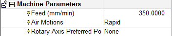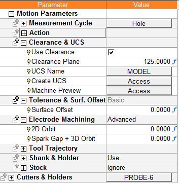 In the Machine Parameters dialog, note that there is no Spin setting, as the probe is not allowed to rotate. The Feed setting may not be needed. The measuring cycles on the machines have their own value for that. The option for Rotary Axis Preferred Position is available as for the milling procedures with the same consideration.