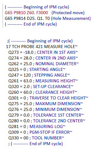 Post Processing – The following are two examples for how the Hole measurement procedure is output for FANUC (Renishaw) and Heidenhain, respectively.