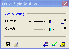 Through this dialog you may set the active style for any curve or face/object. For curves, this means the active Line Width, Line Style (solid line, dashed line, etc.), and line Color. For objects, this means the active Color of a face/object.
