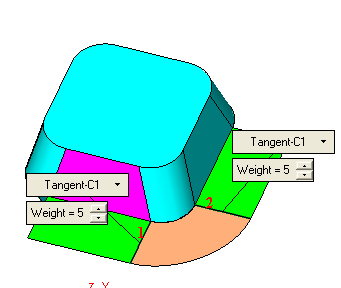 Create a blend face using the following two lines (1 and 2) as the sections and the curve indicated as the boundary.