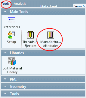 Select the Manufacturing Attributes tool from the Tools dropdown menu.
