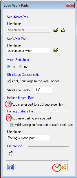 Select the Add Master Part to ECO Sub-Assembly checkbox. This option opens a new sub-assembly (ECO) under the main parting assembly and places a copy of the master file used by the work file. (The copied master file will be used later for compare operations.)