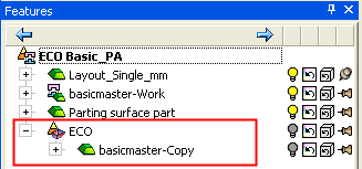 The ECO Assembly was created under the parting assembly. It contains a copy of the master file used by the work file.