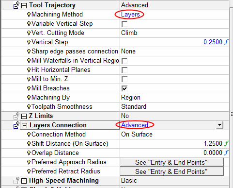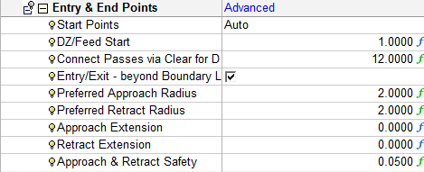 Notice that in the Preferred Approach and Retract Radius parameters you are directed to the Entry and End Points section. The Entry and End Points dropdown list was automatically set to Advanced, enabling you to set the preferred radii.