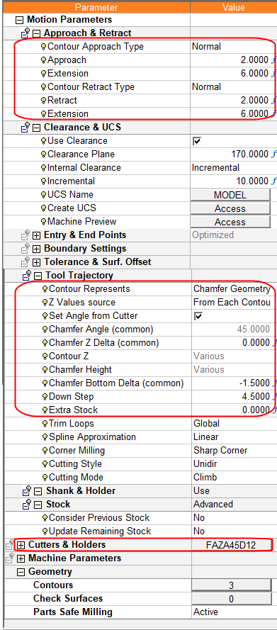 Set the values as shown in the following image, ensuring that the parameter Contour Represents is set to Chamfer Geometry Bottom.