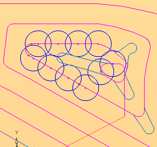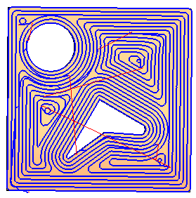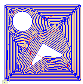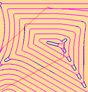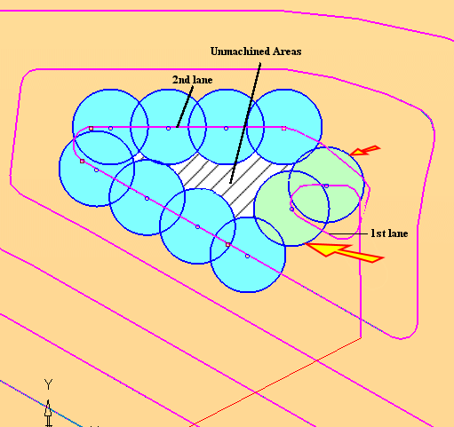 In the example below, the effective tool that the user has defined is small and, therefore, the unmachined area between the lanes is large. In this case, an extra motionextra motion will be performed to cover this unmachined area.