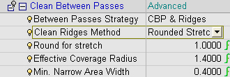 The Effective Coverage Radius allows you to control the detection of the unmachined areas. This parameter indicates how big the unmachined area is and whether it needs to be machined by extra clean motions. Value range is between <0.6 * Side Step> and <0.99 * Side Step> or <0.99 * Tool Diameter/2>.