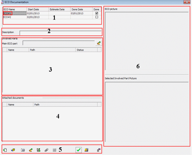 The ECO Documentation window is displayed. This window is divided into 6 areas: