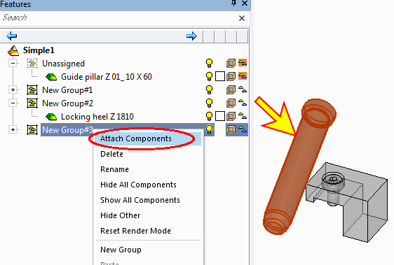 Select Guide Pillar Z01, then right-click the third group and click Attach Components to add the pillar to the selected group.