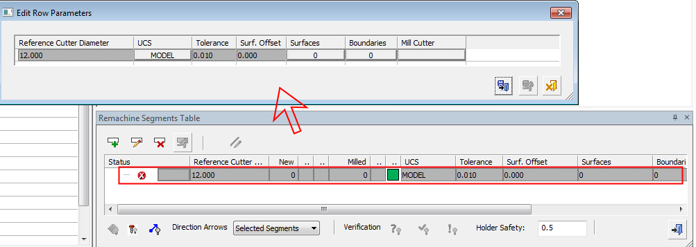 A new row is shown in the Remachine Segments Table and a new Edit Row Parameter dialog appears above it. This dialog contains the parameters for calculating the CleanUp segments.