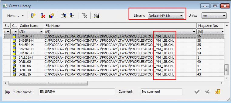 The name of the currently displayed library is Default MM Lib and it contains, by default, only the local .chl files (TOOL_MM_LIB.CHL).