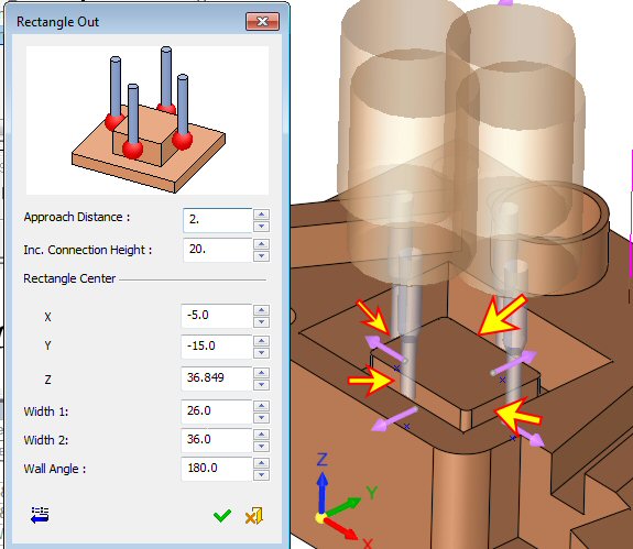 Notice that after the 2nd wall has been picked, all arrows are shifted and positioned in the middle of each wall, pointing away from the rectangle feature center and are in the same height.
