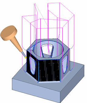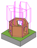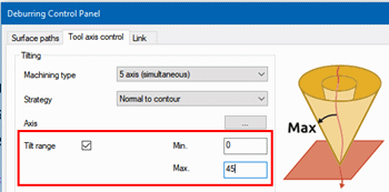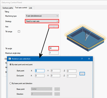 The Fixed to main axis option keeps the tool axis at a fixed angle to an axis, but with the possibility to tilt away if necessary due to collision avoidance calculations. It is expected to be the most used option because it provides minimal tilting with full flexibility and collision avoidance.